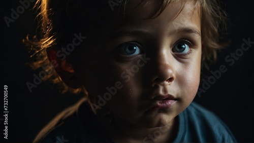 A young cute toddler baby with blue eyes closeup shot in a dark room, boy representing child stress