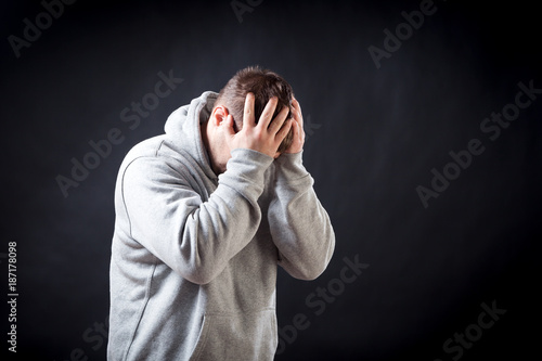 A young dark-haired man in a sporting gray sweatshirt is upset, upset and keeps his hands on his head on a black isolated background, the torturer suffers a headache