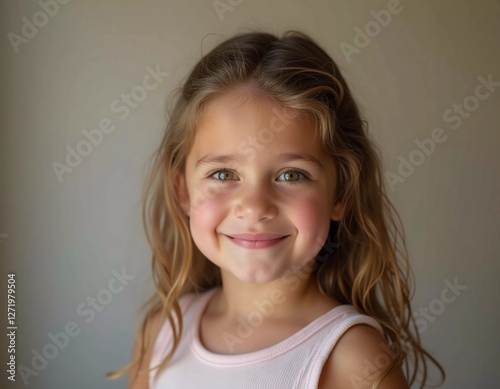 A young girl 5-10 years old, resident of USA, with curly hair stands in a well-lit room, wearing a light dress and smiling happily, showcasing her joyful personality and playful spirit. Generative AI