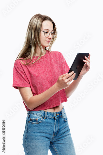 A young girl in jeans with a tablet in her hands. Isolated on a white background. Vertical.