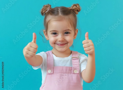 A young girl in pink overalls giving a thumbs-up gesture, set against a turquoise background,