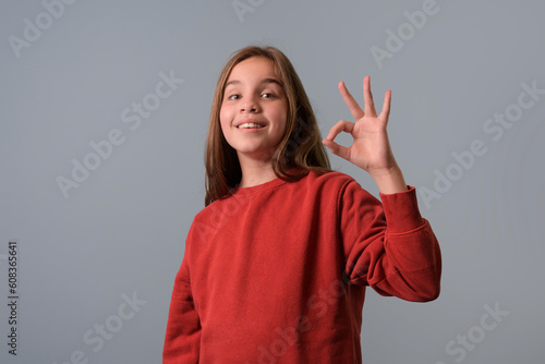 A young girl in red clothes smiles, winks and shows fingers, ok sign and gesture. Isolated on a gray studio background.