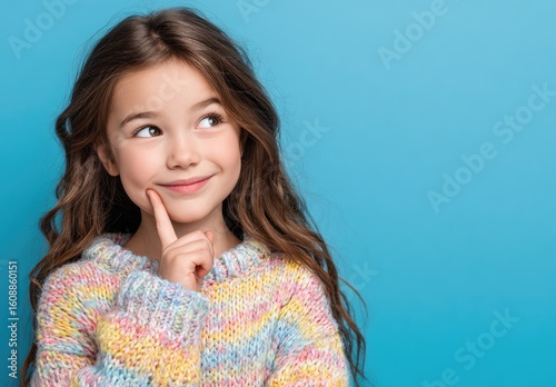 A young girl is smiling and looking to the side, with her hand on her chin as if she's thinking or having an idea.