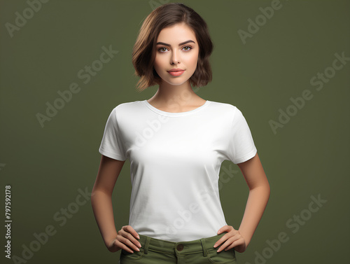 a young girl wear white t shirt mockup on olive green clean background, 3d render 4k, 8k, clean, high resolution, realistic