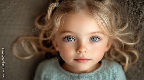 A young girl with blonde hair and blue eyes is laying on a couch. She has a green sweater on and her hair is in pigtails