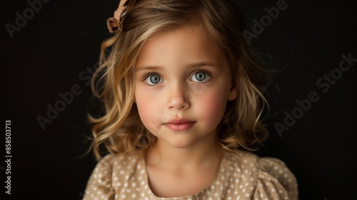 A young girl with blonde hair and blue eyes poses for a studio portrait