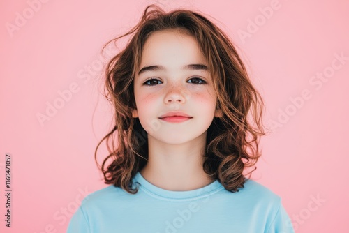 A young girl with blonde hair and blue eyes smiles warmly, standing against a soft pink background. Her joyful expression and the pastel setting create a cheerful and inviting portrait.
