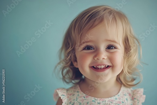A young girl with blue eyes and blonde hair smiles gently, her innocence framed by a soft blue background and turquoise background.
