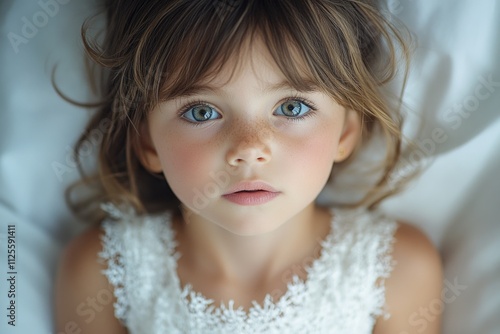 A young girl with blue eyes is lying down on a bed, looking peaceful