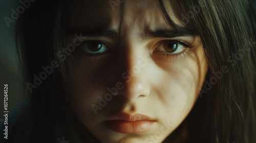 A young girl with captivating green eyes and dark hair displays a serious expression, conveying deep emotions. The focus is on her intense gaze and facial features, highlighting her feelings.