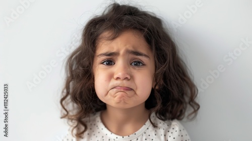 A young girl with curly brown hair and a white shirt displaying a sad and upset expression.