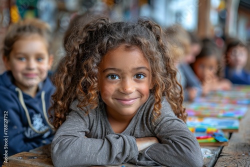 A young girl with curly hair smiles brightly, sitting at a wooden table in a classroom with peers in the background