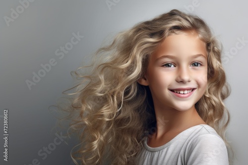 A young girl with long blonde hair smiling. This image can be used to portray happiness, youthfulness, and positivity