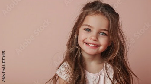 A young girl with long brown hair smiles warmly against a soft pink backdrop