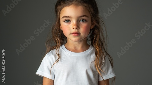 A young girl with long, flowing hair stands confidently, dressed in a plain white mock up t-shirt. Her bright eyes and gentle expression convey curiosity and innocence