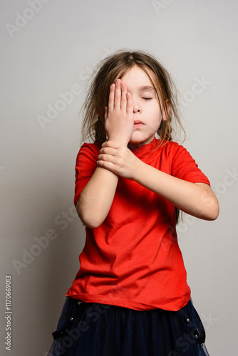 A young girl with messy brown hair wears a red shirt and dark skirt. She has one hand over her eye, appearing pensive or tired. The background is plain.