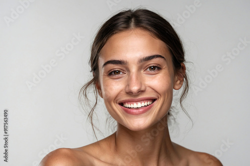 A young Italian woman with flawless skin, beaming with joy. He touched her cheek, highlighting her glowing skin against the white background