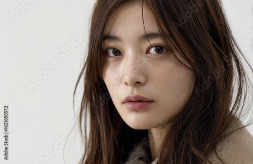 A young Japanese woman in brown cloth exudes elegance and charm, with white background highlighting her effortless grace and soft features.