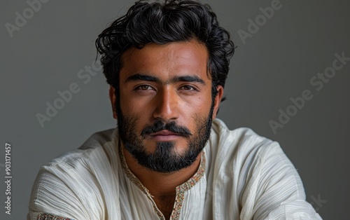 A young man dressed in traditional Pakistani clothing gazes intently, showcasing his cultural heritage and confident demeanor
