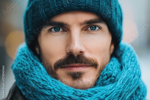 A young man exhibits a trendy winter outfit featuring a vibrant scarf and beanie, standing confidently in an urban environment amidst chilly weather