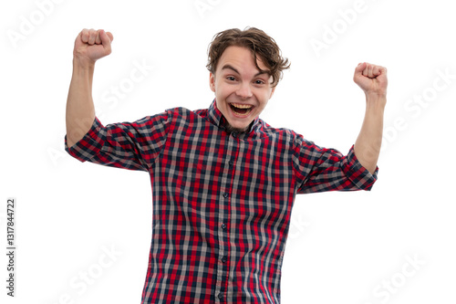 A young man in a checkered shirt smiling and raising his arms in excitement against a white background.