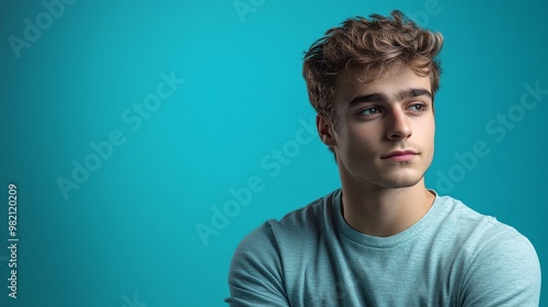 A young man in a grey t-shirt looks thoughtfully off to the side.