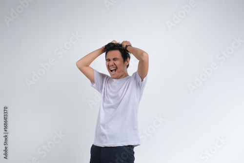 A young man in a white t-shirt pulling his hair with a frustrated and stressed expression. Studio shot on plain background showing human emotion.