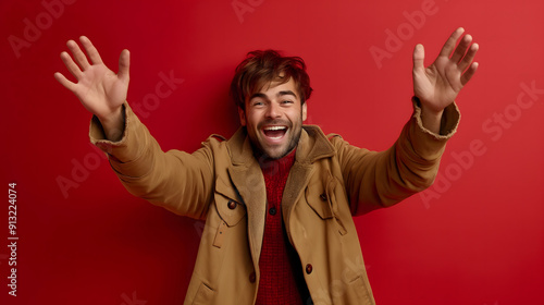 A young man smiles widely with open arms, radiating happiness in front of a vibrant red background