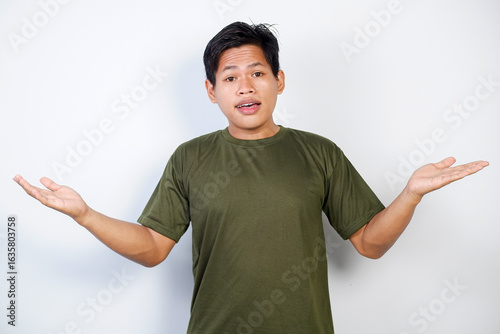A young man wearing a green shirt raises his hands in an expressive gesture of confusion on a white background.