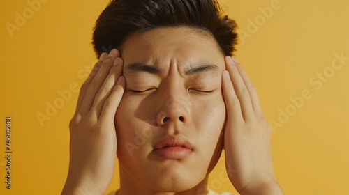 A young man with closed eyes pressing his hands against his temples expressing a sense of stress or discomfort against a yellow background.