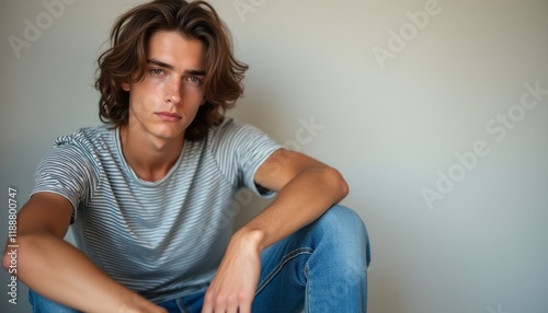 A young man with flowing, wavy hair sits pensively against a soft, neutral background, exuding a sense of calm and introspection. His casual striped shirt and relaxed posture convey a laid-back vibe