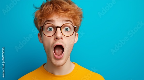 A young man with glasses and a surprised expression on his face. Concept of excitement and surprise