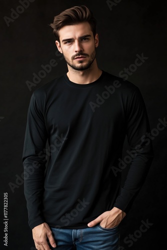 A young man with stylish hair wearing a black long sleeve T-shirt mockup, posing against a dark background. He has a serious expression, showcasing a modern and fashionable look.