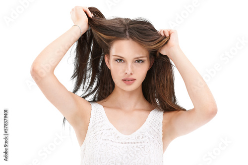 A young model flaunts her voluminous, long, and blonde hair while showcasing her natural beauty isolated on a png background.