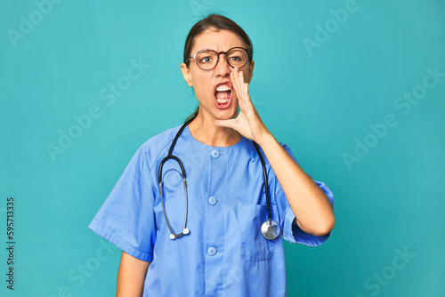 A young nurse woman isolated shouting and holding palm near opened mouth.