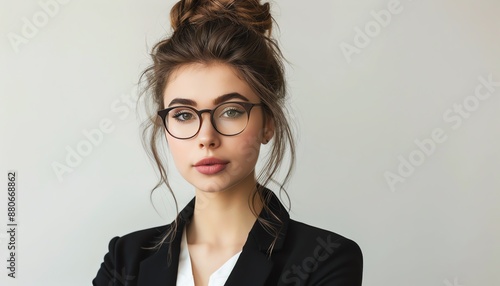 A young professional woman with brown hair in a bun wearing glasses and a black suit jacket looks confidently at the camera.
