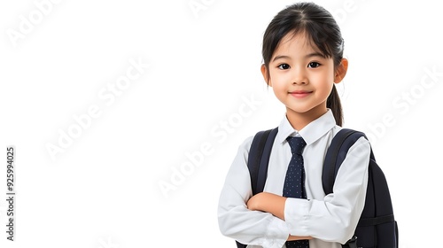 A young school girl in a white shirt and tie with a backpack stands with her arms crossed, looking confidently at the camera against a white background.