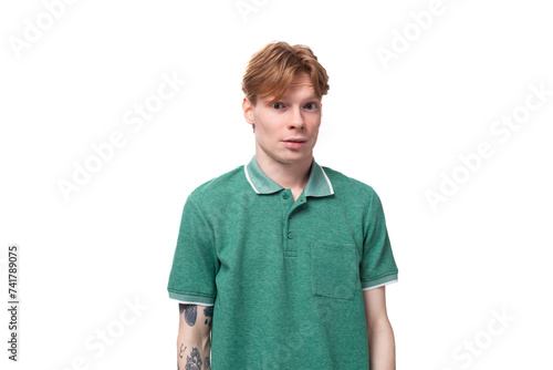 a young slender ginger man with a tattoo on his arm, dressed in a green T-shirt with bright facial expressions