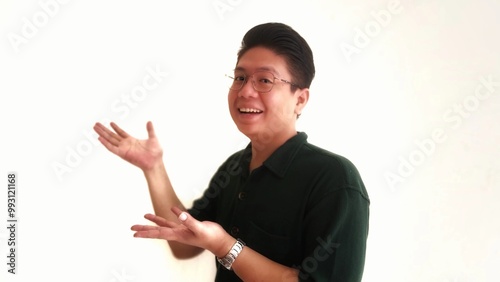 a young Southeast Asian man wearing a black shirt confused raising both hands over isolated white background giving what is allowed to do is okay