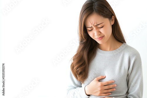 A young woman appears distressed, holding her stomach in discomfort. Her expression reflects pain or unease, suggesting a moment of vulnerability and emotional struggle.