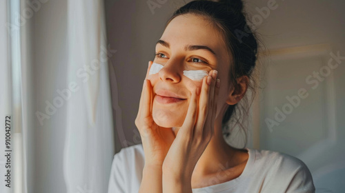 A young woman applies moisturizing cream to her face, smiling serenely in the soft morning light streaming through a window.