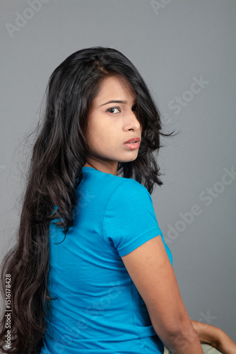 A young woman confidently poses wearing blue t-shirt, distressed denim jeans, heels, showcasing a casual urban style with charm and elegance, suitable for haircare, freedom, self-expression project