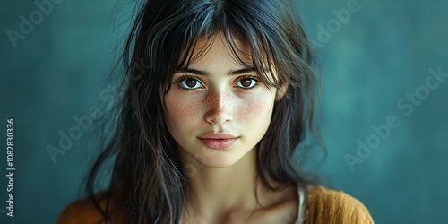 A Young Woman Gazes Thoughtfully at the Camera With Natural Beauty in Soft Lighting Against a Textured Blue Background