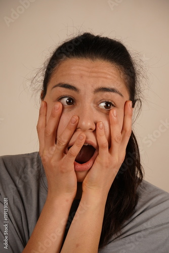 A young woman holds her hands over her face, her eyes wide open and her mouth open in genuine surprise. The interesting facial expression conveys a moment of surprise. The focus is on her emotions.