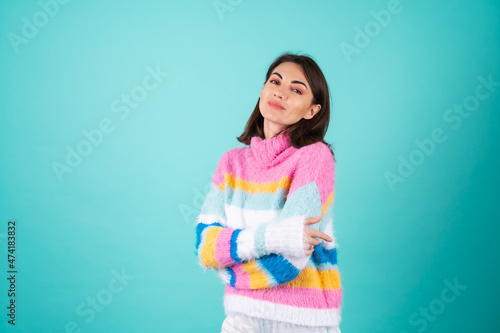 A young woman in a bright multicolored sweater on a blue background smiles cutely, looks at the camera, arms crossed on her chest, radiates calmness and confidence
