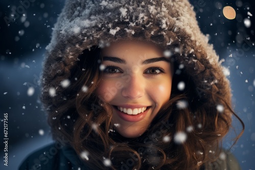 A young woman in a cozy winter hat, standing amidst gently falling snowflakes, her eyes sparkling with the magic of Christmas
