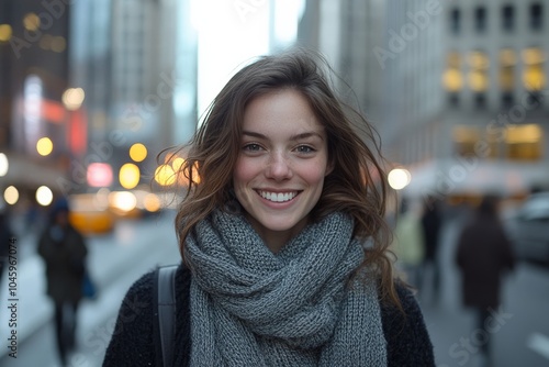 A young woman in a gray scarf smiles warmly amid a bustling city street at dusk, surrounded by glowing city lights, capturing the essence of urban life.