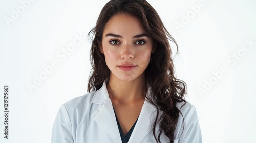 A young woman in a lab coat conducting a medical test with a serious look on a white isolated background