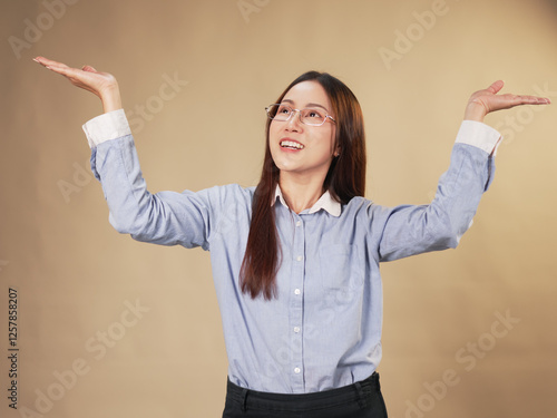 A young woman in a light blue shirt and glasses is smiling while raising both hands in an expressive gesture, looking cheerful and confident