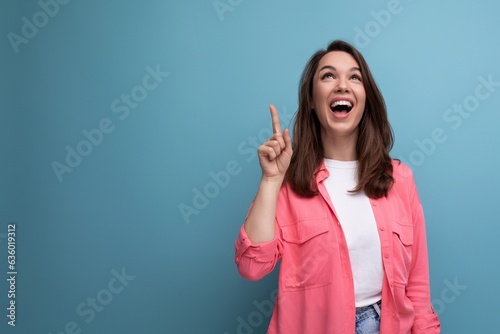 a young woman in a pink shirt and jeans got an insight and points a finger up on a studio isolated background